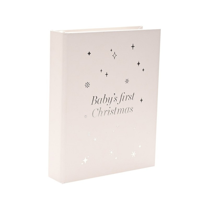 Albumul foto pentru Craciun este fabricat din carton, este alb si inscriptionat cu mesajul "Baby's First Christmas" (primul Craciun al bebelusului).