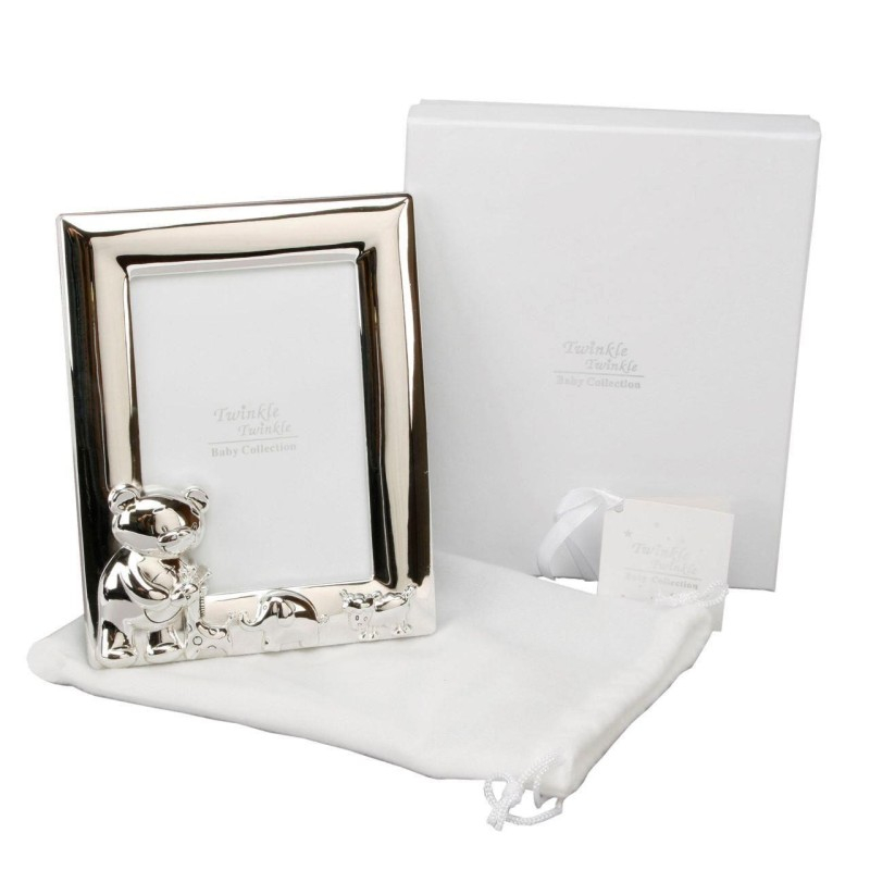 Rama foto argintata este decorata cu patru animalute haioase si are dimensiunile 19.5 x 16 centimetri.