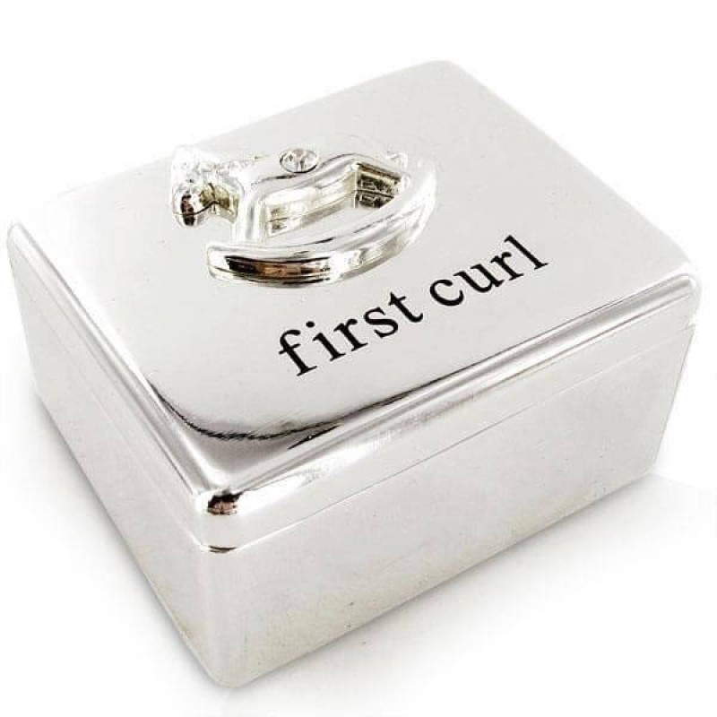 Cutiuta este argintata pe exterior si contine mesajul "first curl" ("prima suvita").