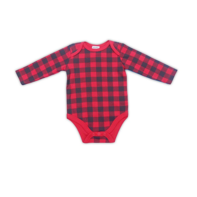 Setul include 3 piese asortate cu design de Craciun: o bavetica cu ren, un body cu maneca lunga in carouri si o pereche de pantalonasi