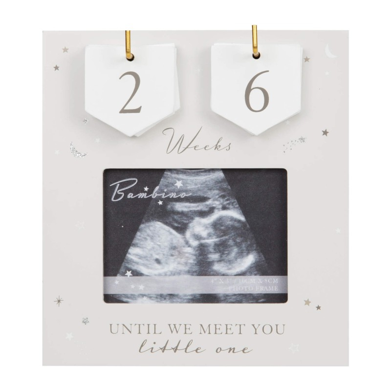 Rama de culoare gri este prevazuta cu numere pe care viitori parinti le pot folosi pentru a numara saptamanile pana la sosirea micutilor si este prevazuta cu un mesaj emotionant: "...weeks until we meet you little one" (...saptamani pana cand te vom intalni, micutule/micuto).