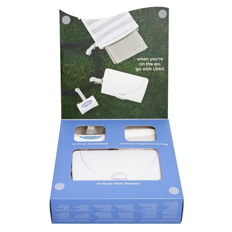 Setul este compus din o geanta portabila cu salteluta schimbat scutece gri, un dispenser portabil pentru pungute scutece Ubbi On The Go alb si un dispenser portabil pentru servetele umede Ubbi On The Go alb