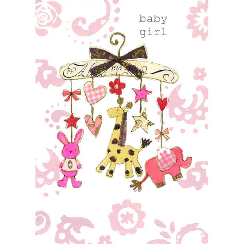 O felicitare simpatica, potrivita pentru a fi daruita parintilor unei fetite, la nastere, botez sau aniversare. Felicitarea este decorata cu animalute vesele si cuvintele "baby girl".