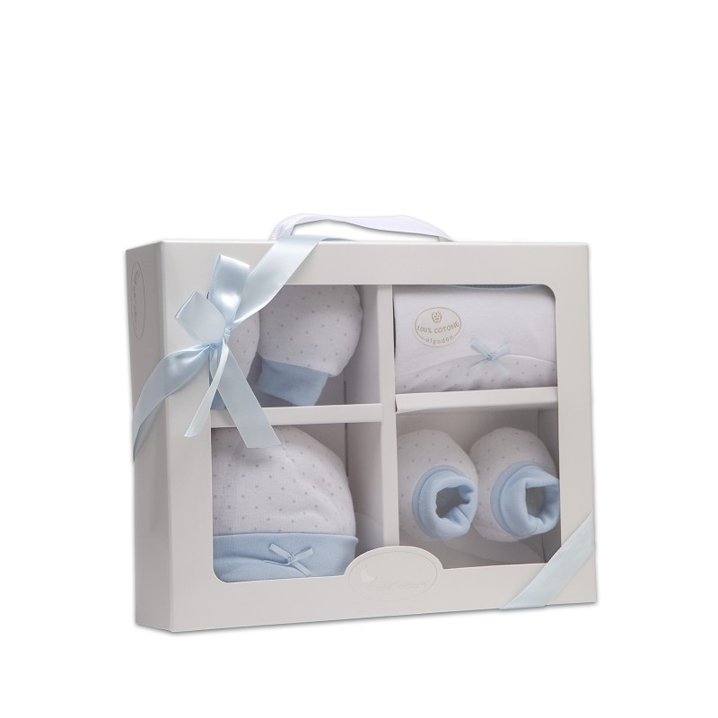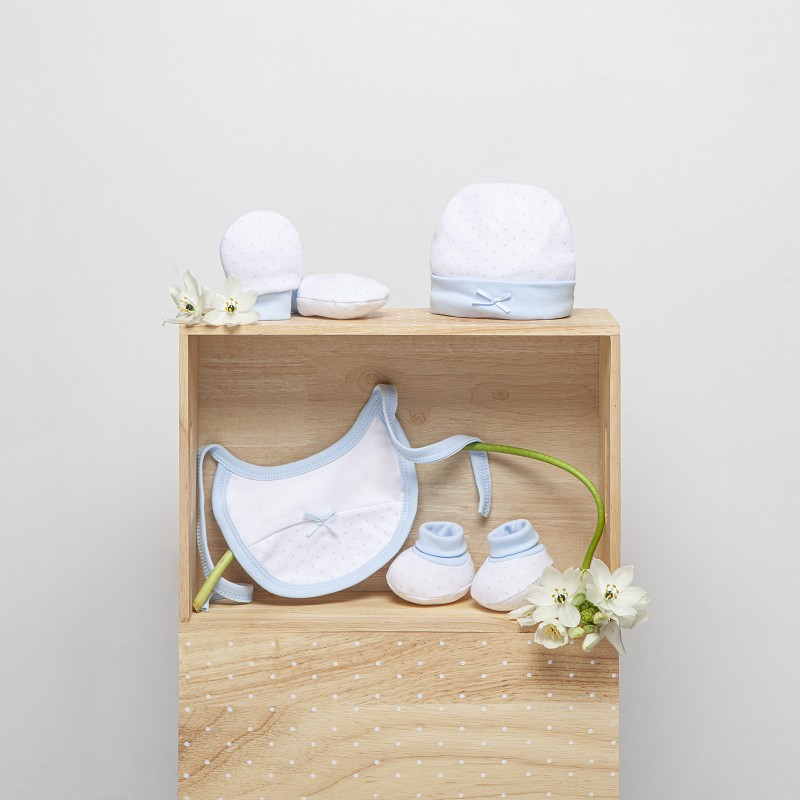 Setul, potrivit pentru a fi daruit unui nou-nascut, este compus dintr-o bavetica, manusi, o pereche de botosei si o caciulita asortata.
