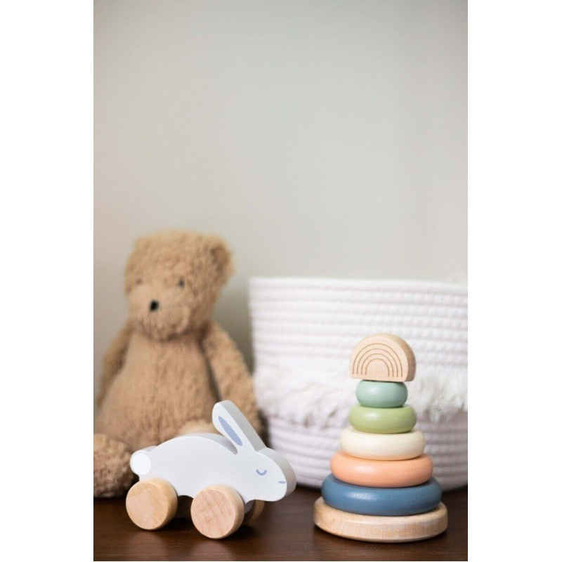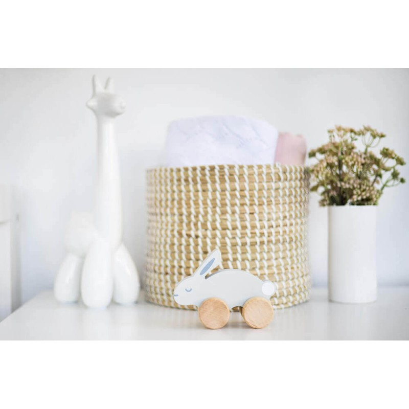 Micutul va fi incantat sa impinga, sa traga sau sa rostogoleasca acest iepuras simpatic cu roti.