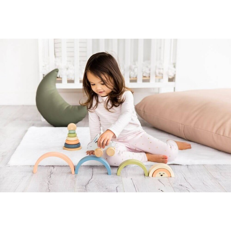 O jucarie dragalasa pentru bebelusi, fabricata din lemn, care ajuta la stimularea curiozitatii, a imaginatiei si a coordonarii mana-ochi a celui mic.