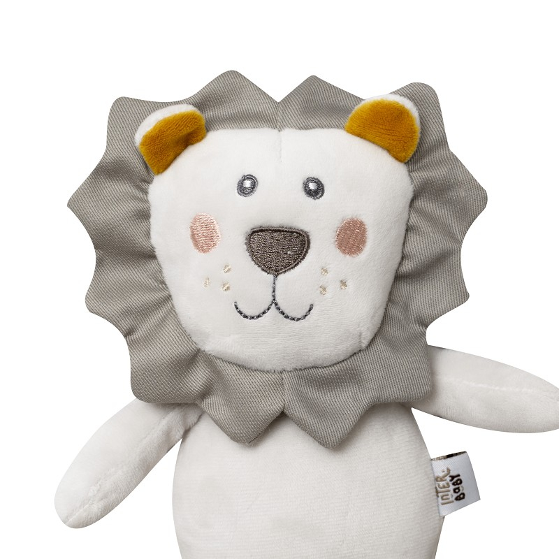 Un simpatic leu zornaitor, fabricat din plus moale, ideal pentru manutele mici ale bebelusului.