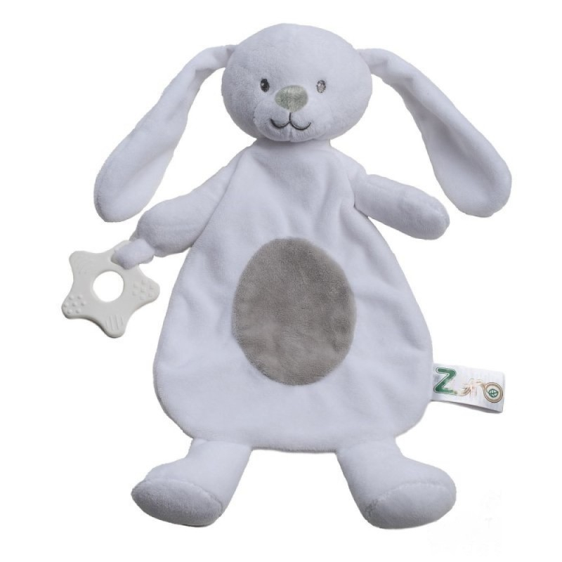 Jucarie de atasament pentru bebelusi cu element dentitie si iepuras alb - Soft Touch