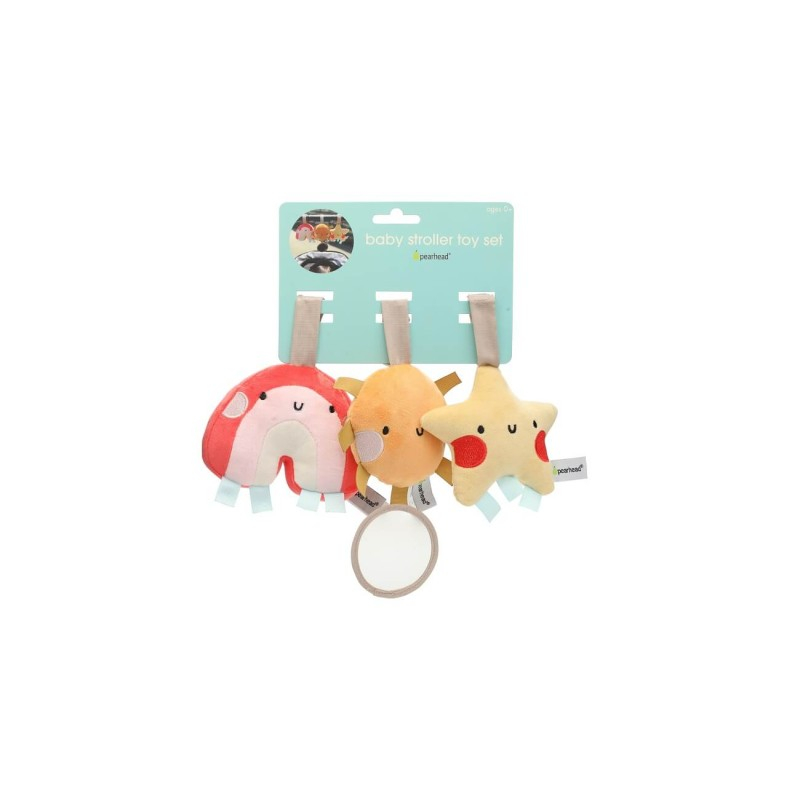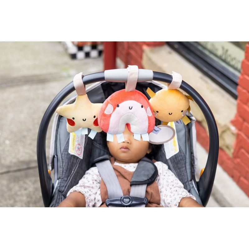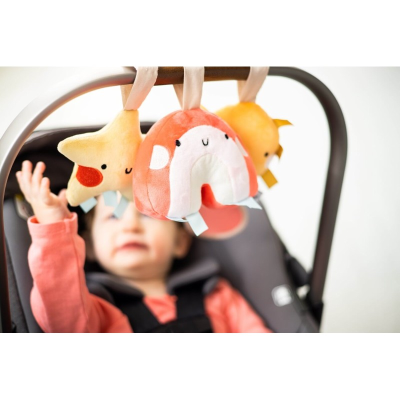 Un set de 3 jucarii de plus, prevazute cu etichete senzoriale, ideale pentru a fi prinse de carucior, patut sau scaunul de masina.