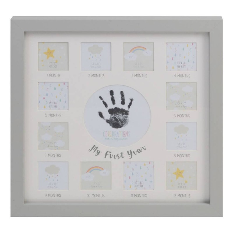Cu 12 spatii dedicate fiecarei luni din primul an de viata si un loc special pentru amprenta, in centru, aceasta rama este perfecta pentru a urmari evolutia si cresterea micutilor.