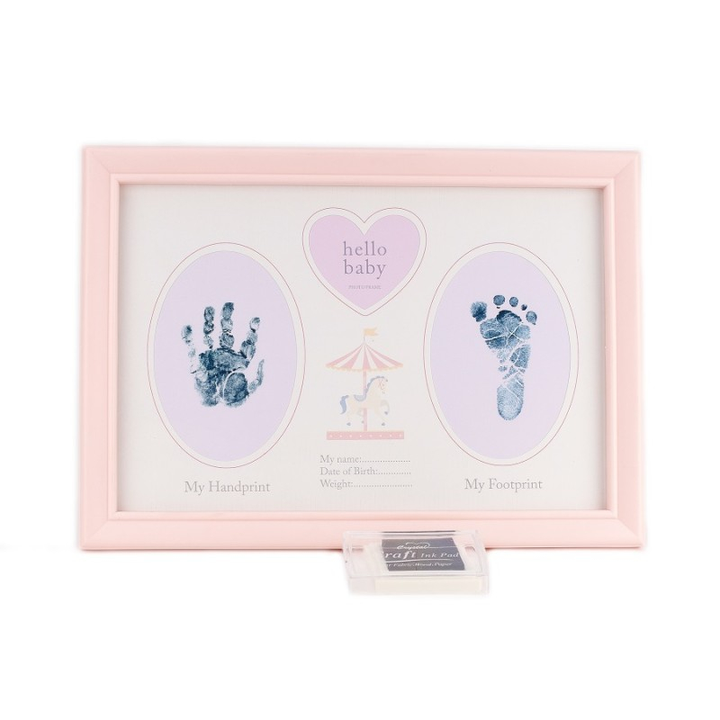 O rama foto fabricata din plastic, roz, cu dimensiunile de 23 x 31.5 x 2.5 centimetri, ideala pentru pastrarea datelor de la nasterea fetitei, a amprentelor sale si a celei mai dragi fotografii din primele sale zile de viata.