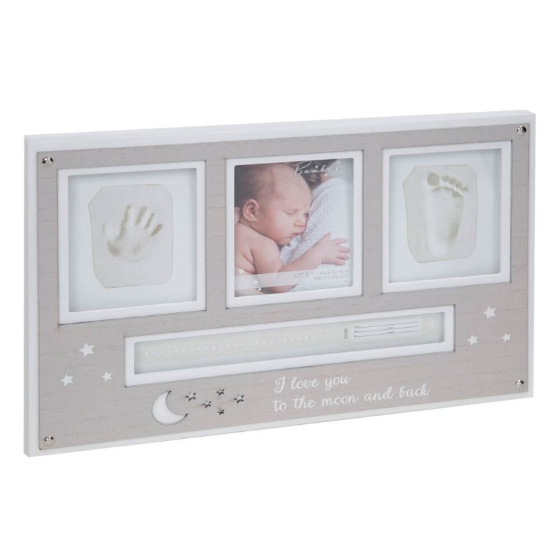 In interiorul acestei rame se pot pune una dintre fotografiile preferate ale bebelusului, mulajul manutei si piciorusului si bratara din maternitate.