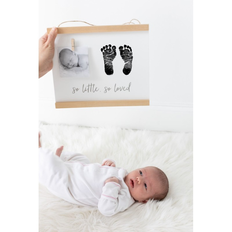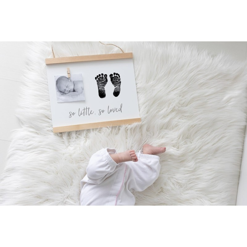 Setul este compus dintr-un suport cu cerneala (cu dimensiunile 9 x 6 centimetri), un tablou alb cu margini nature si un carlig pentru prinderea fotografiei.