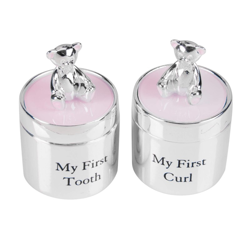 Setul este format din 2 cutiute cu inscriptia "my first tooth", respectiv "my first curl" , simple in interior, prevazute pe capac cate un ursulet argintat, cu urechi roz.