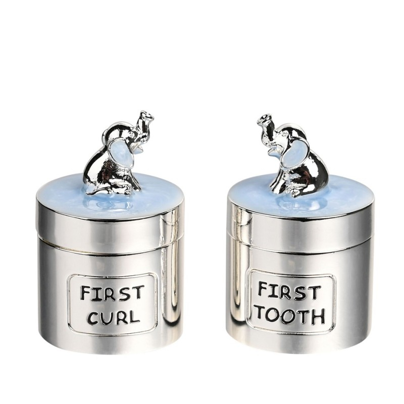 Un set de cutiute argintate,decorate cu elefantei, dedicat pastrarii primei suvite si a primului dintisor. Setul poate fi un excelent cadou pentru mot, cadou pentru botez sau pentru aniversarea bebelusului.