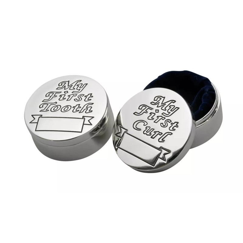Fiecare cutiuta este argintata pe exterior si contine cate un mesaj: "first curl" si "first tooth" (prima suvita si primul dintisor). Interiorul este din catifea.