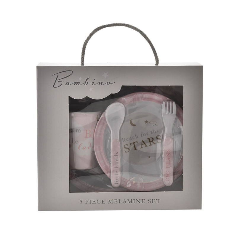 Setul de masa are in componenta sa 5 piese: farfurie, bol, pahar, lingurita si furculita.