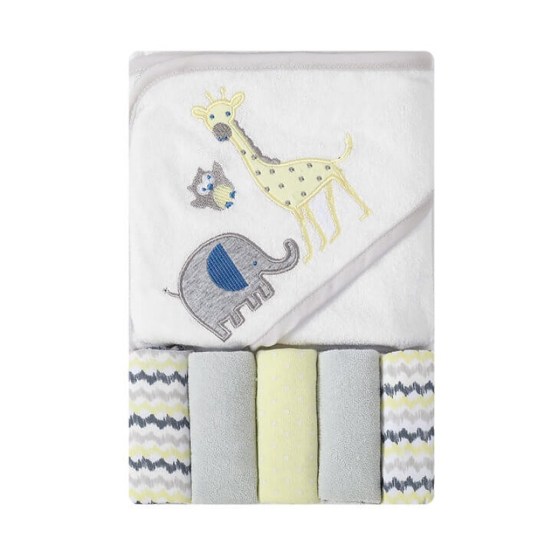 Un set pentru bebelusi format dintr-un un prosop de baie cu gluga si 5 mini prosopele. Setul poate fi un cadou practic si util pentru un nou nascut.