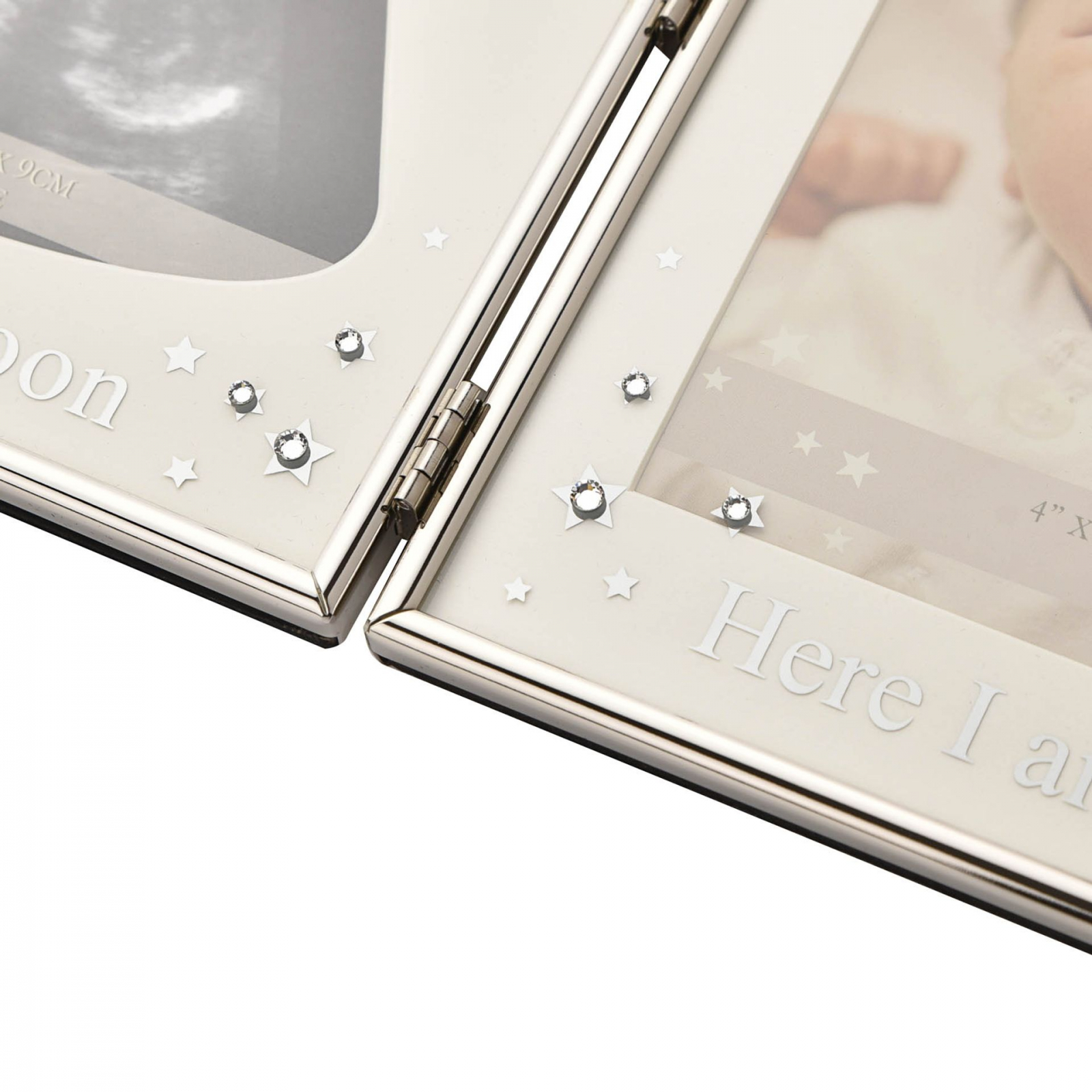 Rama are marginile placate cu argint, este decorata cu strasuri discrete si mesajele "coming soon"si "here I am".