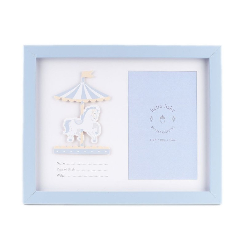 Rama este elegant decorata cu un carusel in relief, este realizata din mdf si permite stocarea unei fotografii cu dimensiunea de 10 x 15 cm si personalizarea cu urmatoarele informatii despre bebelus: